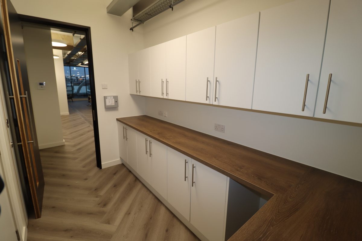 New teapoint consisting of matt white slab doors with oak cabinet handle