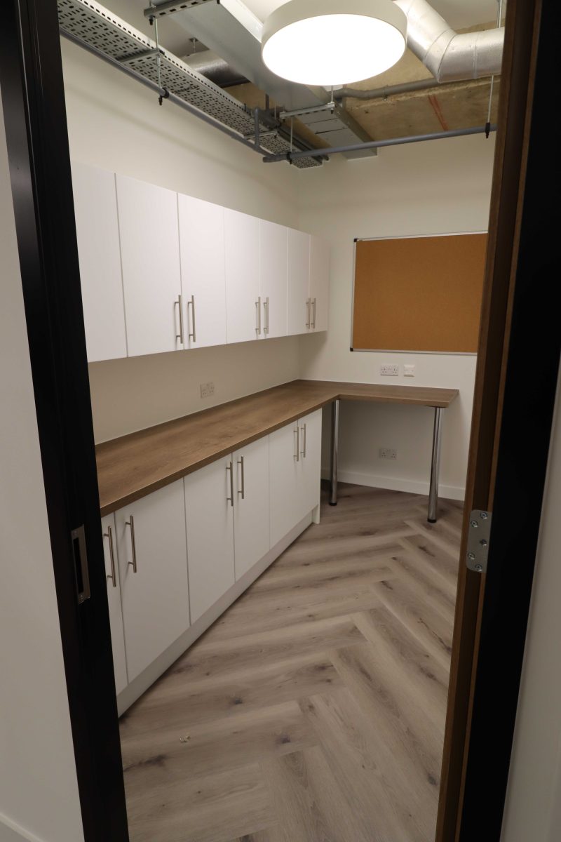 Postrooms finished in matt white slab doors with oak cabinet handle