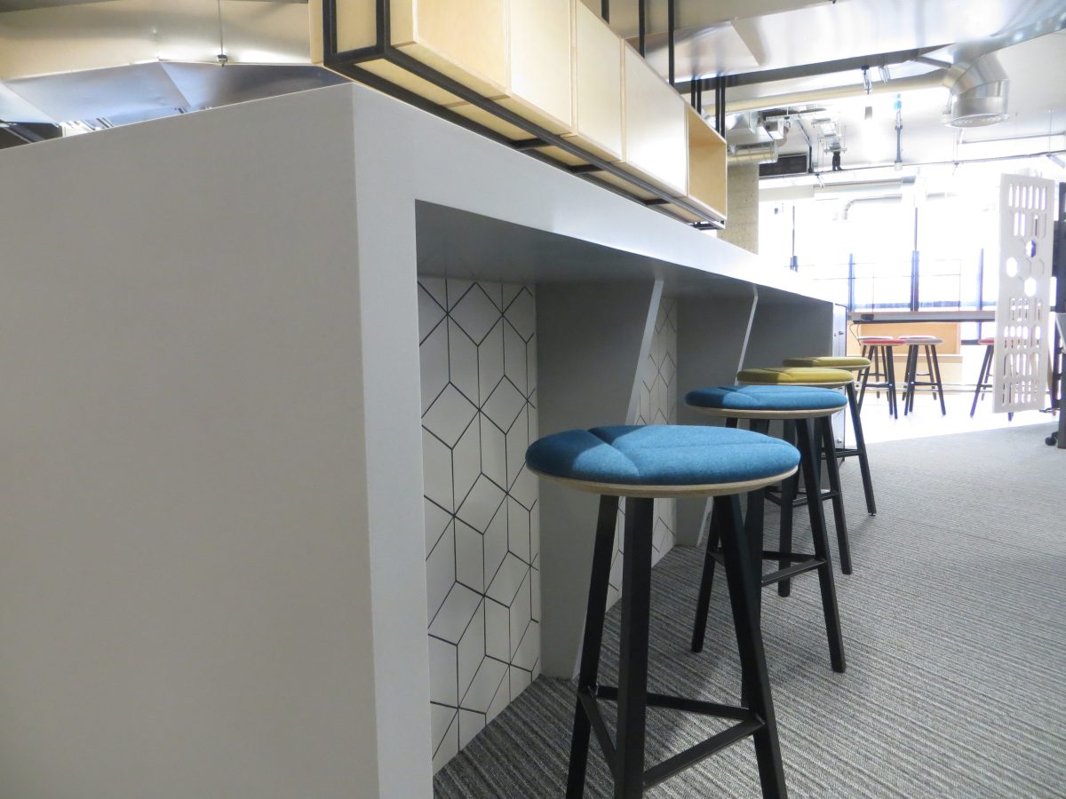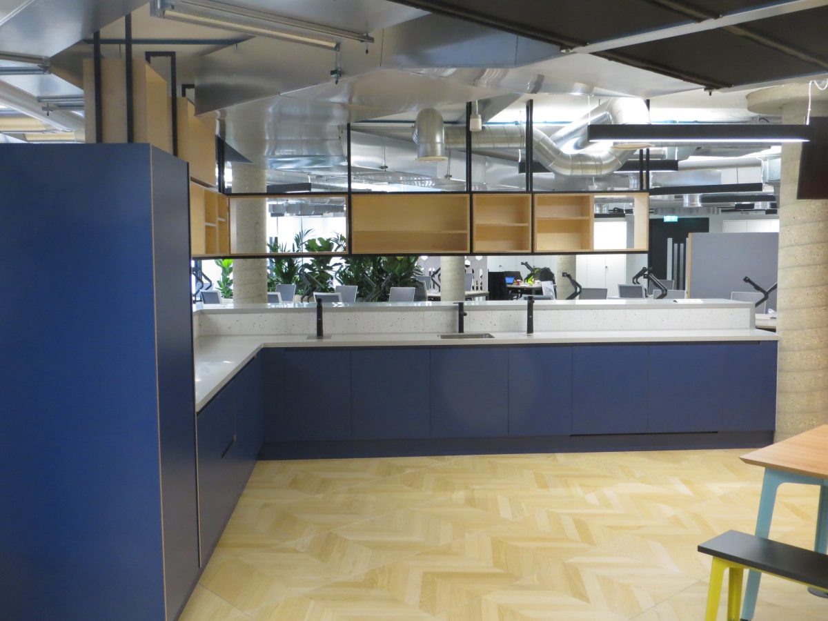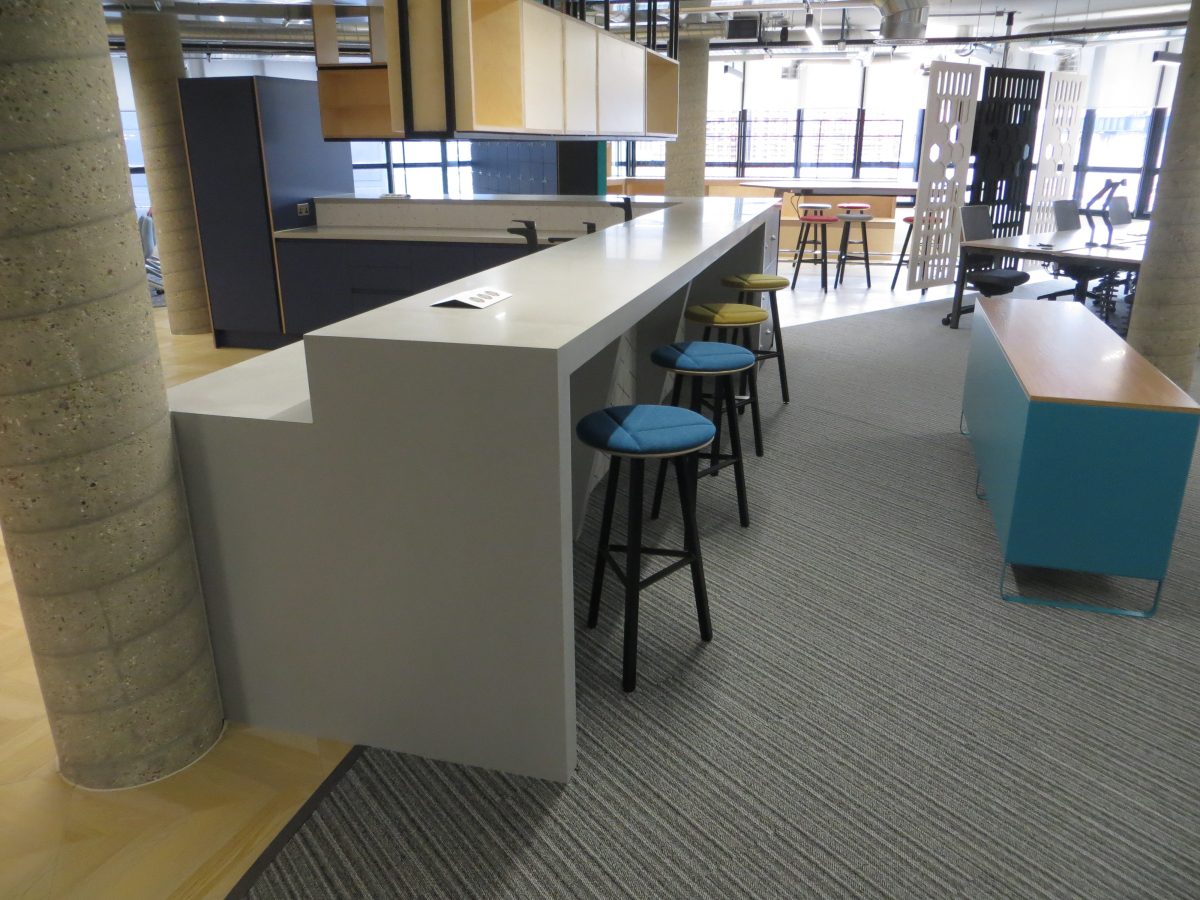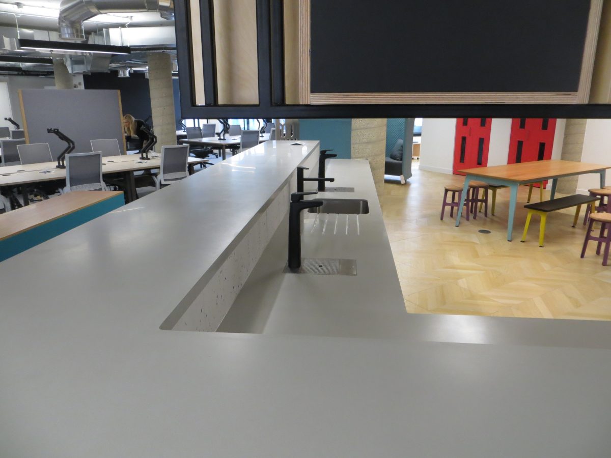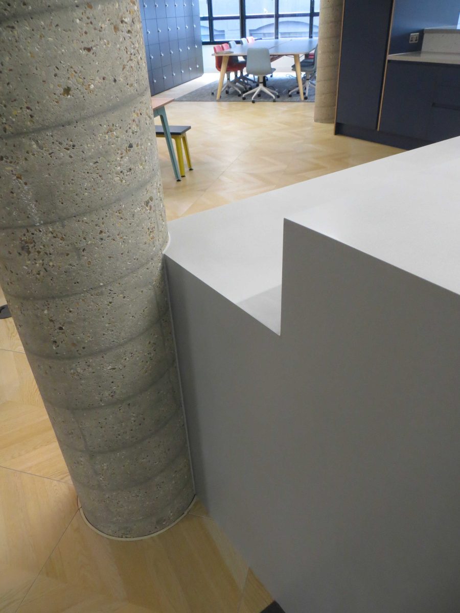 Corian warm grey worktops with slab ends and bespoke angled support panels