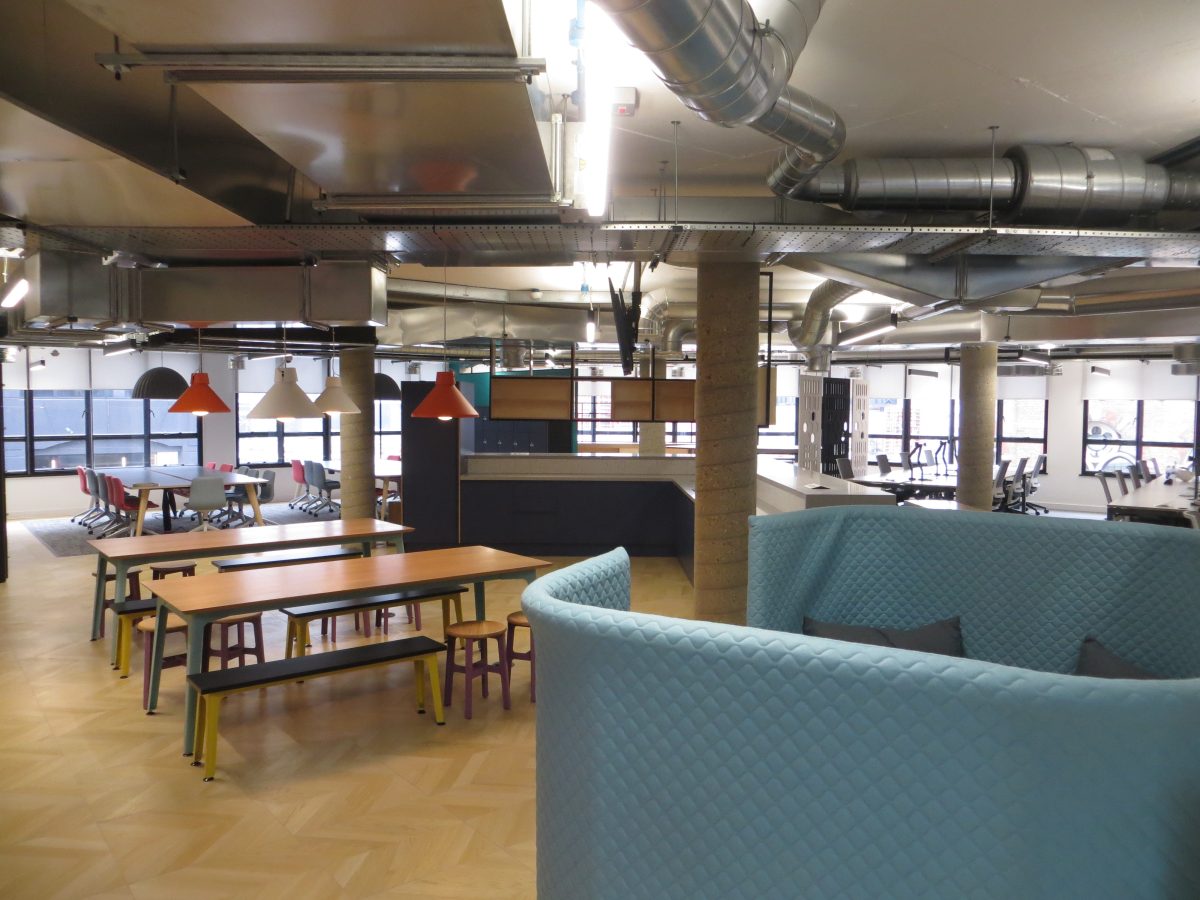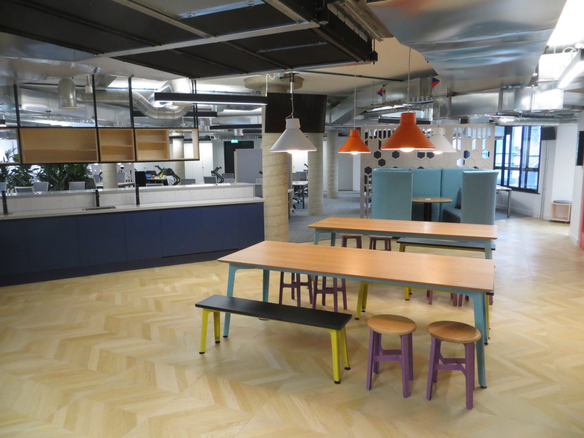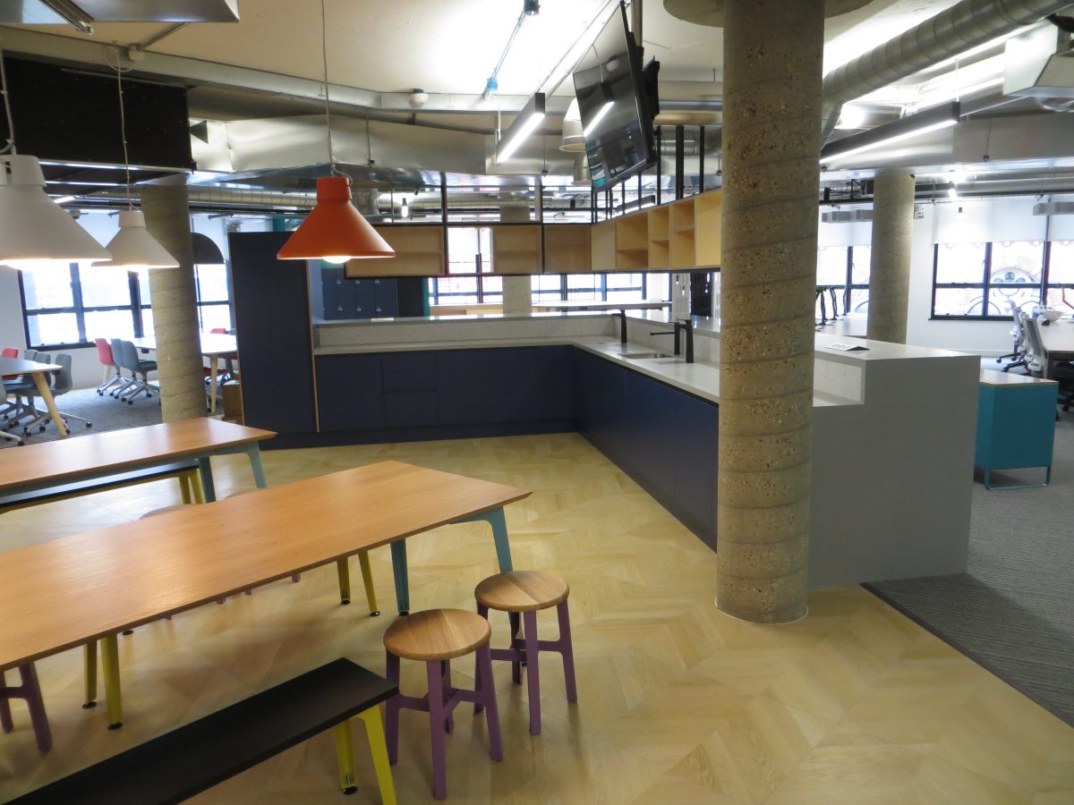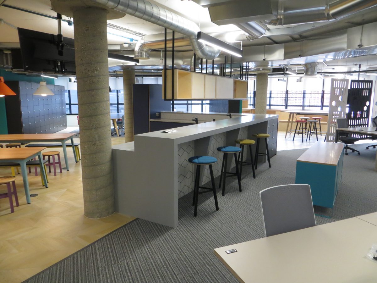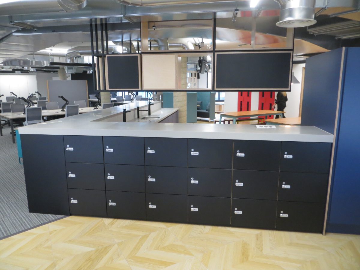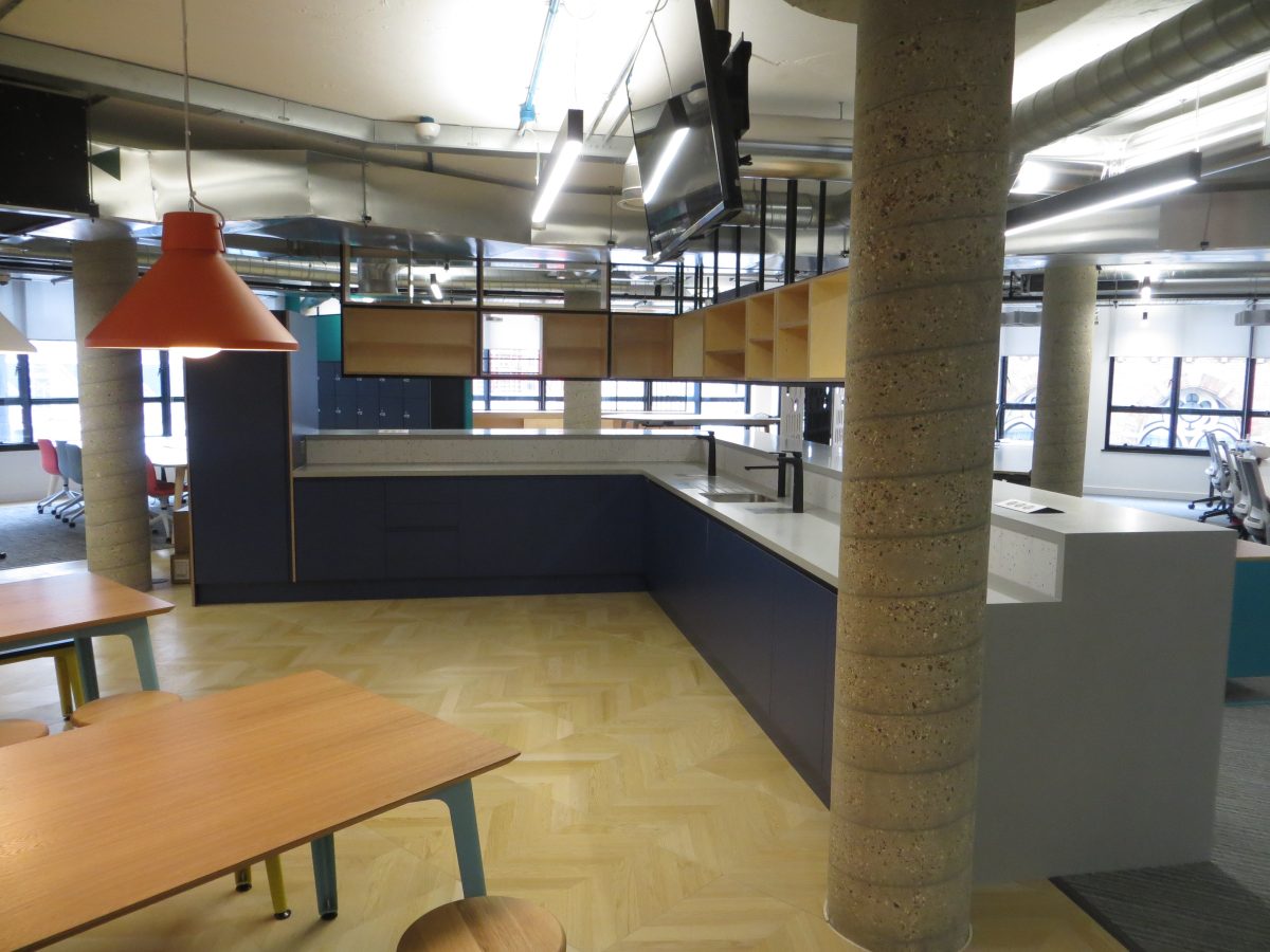 Corian warm grey worktops with slab ends and bespoke angled support panels