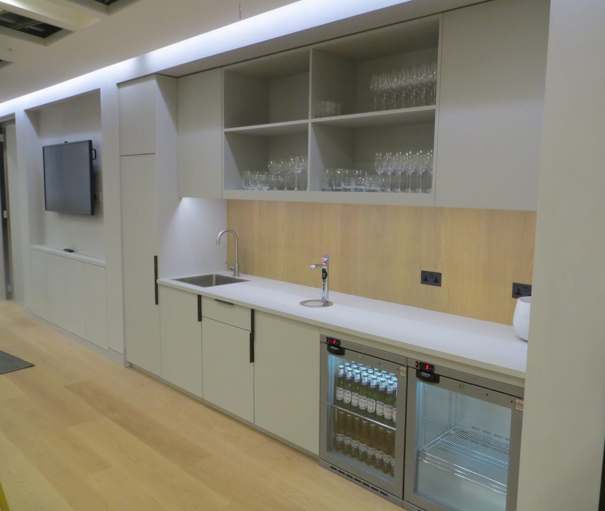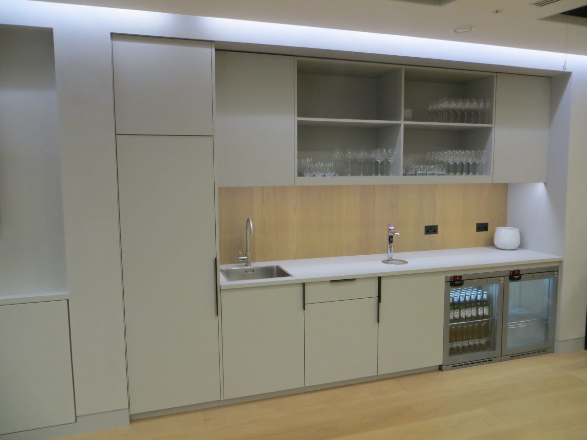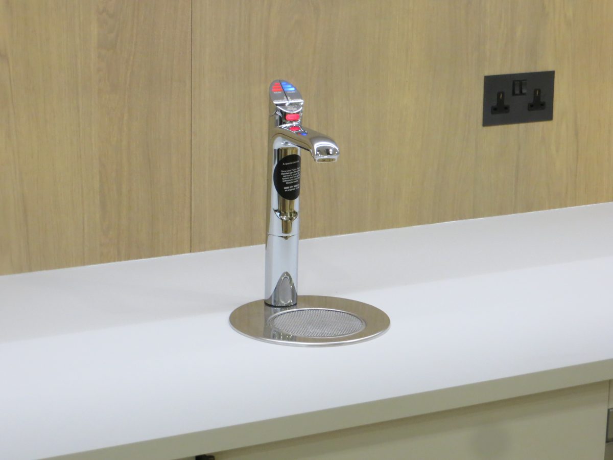 Laminate butcherblock wood effect worktop with stainless steel round bowl sink and top lever tap