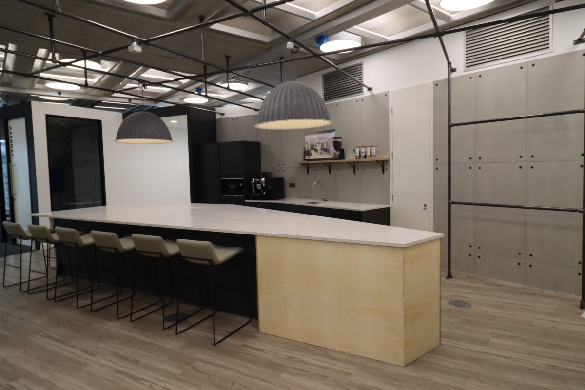 Quartz worktops with undermounted sink and bespoke designed shaped island